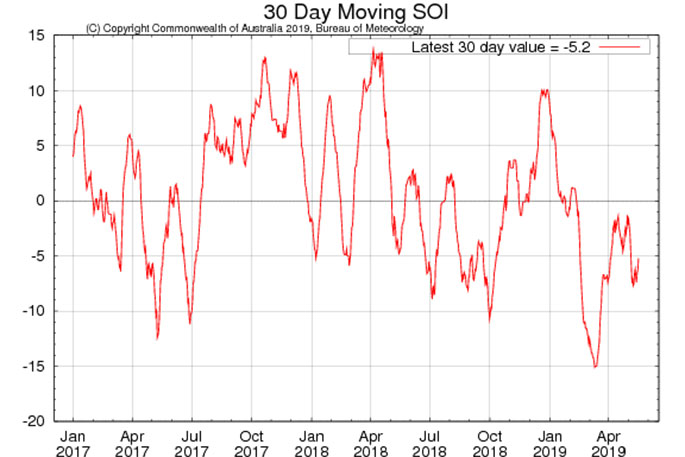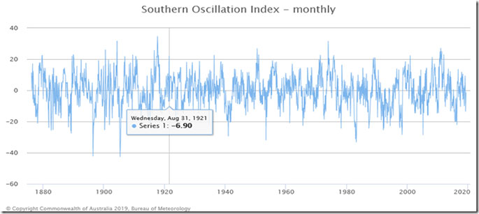 The graph below ( from the Australian Bureau of Meteorology, BOM) shows monthly values of the SOI from 1880 to May 2019..