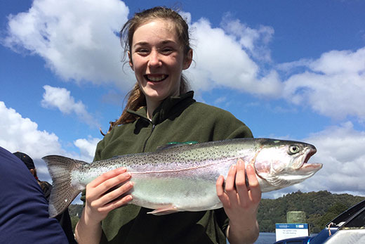 Danika Bay-Waugh, 13, from Rotorua, with one of the 18 fish their family group caught, a 2.1kg rainbow, with one member remarking he could only recall one better Opening Day.
