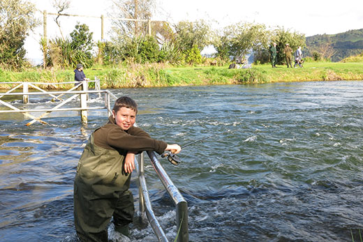 Leo Apimerika, 11, tries his luck at the Ohau Channel. His father Aaron hooked his first fish within 10 seconds of his first cast and the pair had around four fish before mid-morning.