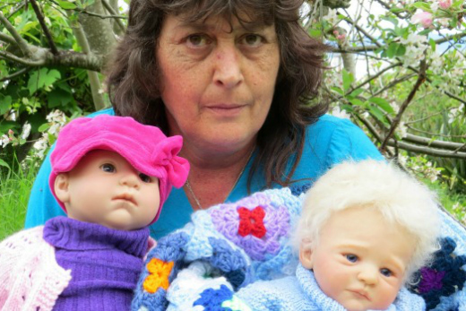 Alice Parris, with two of her reborn dolls Phoebe and RJ, would like Damien returned to her after he was taken from an Animal Rescue fundraising garage sale last month. Photo: Cameron Massey/Stuff