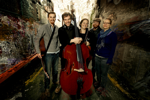 Led by guitarist and vocalist Frank Burkit, the band features Cameron Dusty Burnell on mandolin, Krissy Jackson on fiddle, Kara Filbey on percussion/vocals, and James Geluk on double bass.