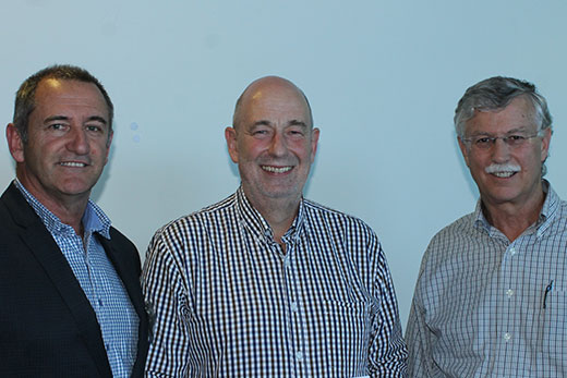NZKGI's new chairman Doug Brown (left) with retiring CEO Mike Chapman and past chairman Neil Trebilco at yesterday's annual general meeting in Mount Maunganui. Photo: Supplied.