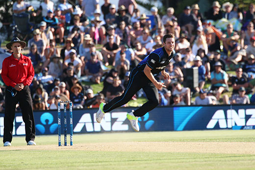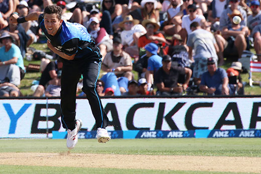 Trent Boult in action at Bay Oval. Photos: Tracy Hardy.