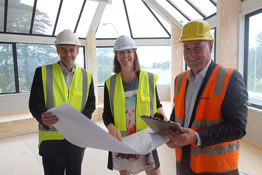 University of Waikato Senior Deputy Vice-Chancellor Professor Alister Jones, left, on site during the early stages of the building's transformation, with Tauranga High Performance Sports Centre manager Justine Brennan, and Bay Venues chief executive Gary Dawson (supplied).
