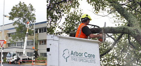 Arbour Care's chainsaws were at work this morning, removing the tree which council staff say has created a flooding problem for the Willow Street council building – twice in the last fortnight.