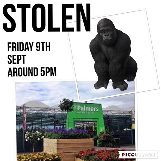 If you have any information about the one metre tall gorilla which was stolen from the Palmers Garden Centre in Bethlem at about 5pm on Friday, September 9, contact your local police station or the centre on 07-579-3925
