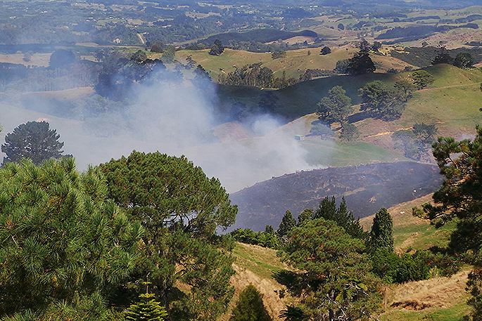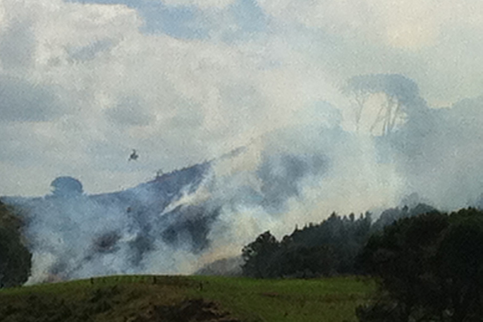 A helicopter with a monsoon bucket has been called to help firefighters quell a scrub fire in Te Puna this afternoon.