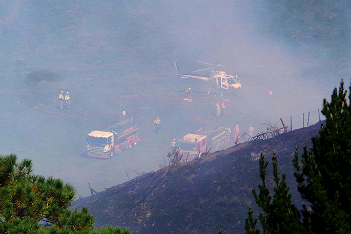 A helicopter using monsoon buckets to douse the blaze. Photos: Tamsin Phillips.