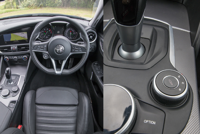 The centre console has three rotary dials, one for radio volume and another acting as a control mouse for the menu on the centre console screen. They fit snugly where the driver's free hand may lie, meaning everything is at arm's length. The third dial is the control for Alfa's DNA driving mode system and suspension damping controls described above.