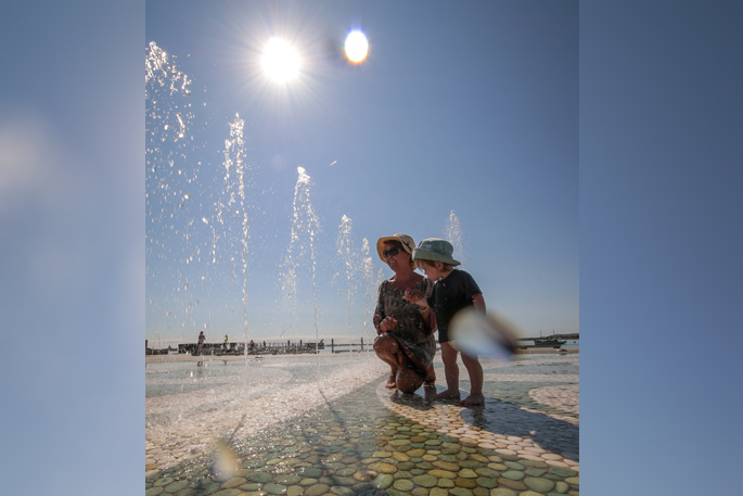 Julie Davies and Tito (1yr) playing in the fountain at The Strand TCC playground.
