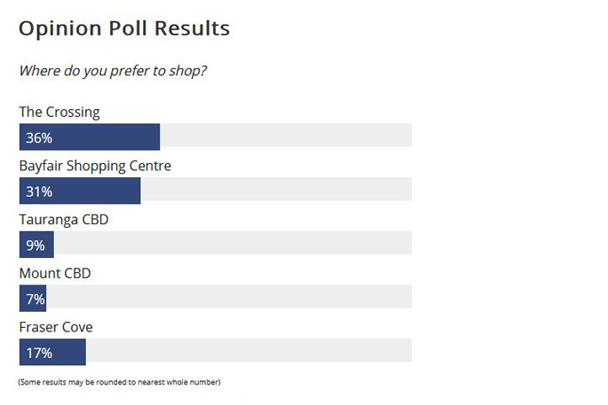 The poll, which ran on the website for a week, asked people where they preferred to shop, with options being The Crossing, Bayfair Shopping Centre, Tauranga CBD, Mount CBD and Fraser Cove.