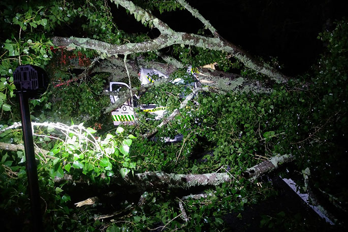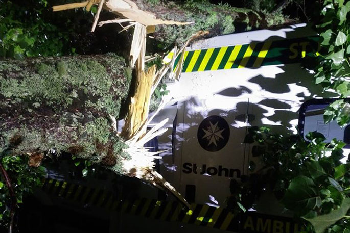 An ambulance was crushed when a tree fell on it in Ohope. A police spokesperson says there was no one injured.