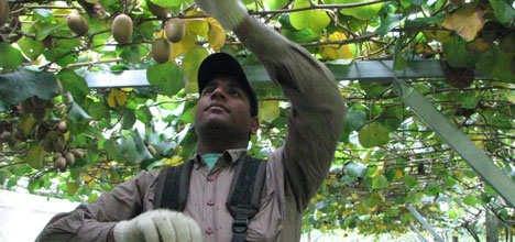 Rajveer Singh harvests the new gold Zespri kiwifruit G3 on the organic orchard in Pyes Pa owned by Dave Goodwin.