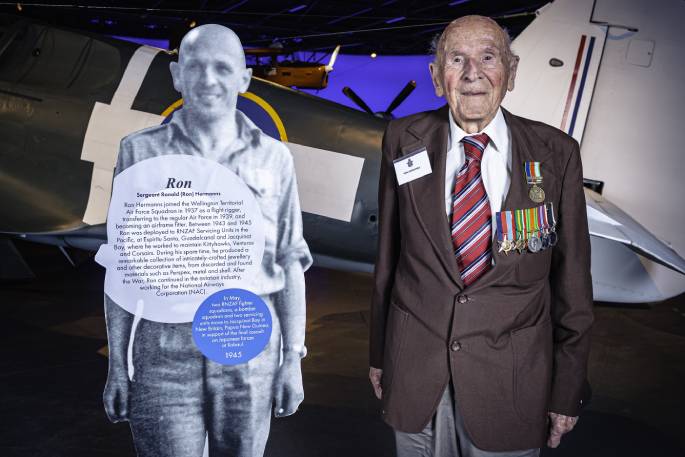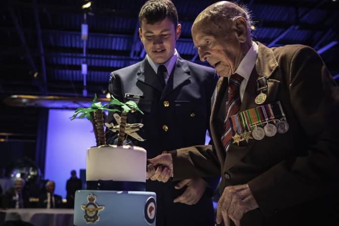A number of invited guests and dignitaries joined Hermanns in celebrating his 108th birthday at a reception at the Air Force Museum of New Zealand in Christchurch in 2019. Pictured l-r: Aircraftman Hamish Batchelor (then youngest airman in the RNZAF), Mr Viv De Beus (General Manager – Aircraft Maintenance, Air New Zealand), Hon. Ron Mark (then Minister of Defence and Veterans' Affairs), Mr Ron Hermanns, Air Vice-Marshal Andrew Clark (Chief of Air Force), Her Worship Lianne Dalziel (Mayor of Christchurch). Image: NZDF.