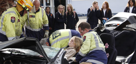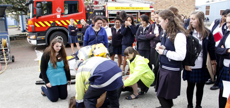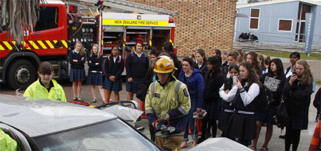 Firefighters worked to rescue students from a crashed car at Tauranga Girls' College on Wednesday afternoon – but their efforts were all for show.