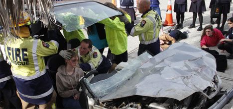 On Wednesday lunchtime students gathered in the school grounds to watch as Tauranga firefighters used the jaws of life to remove trapped and bloodied bodies from the crashed car.