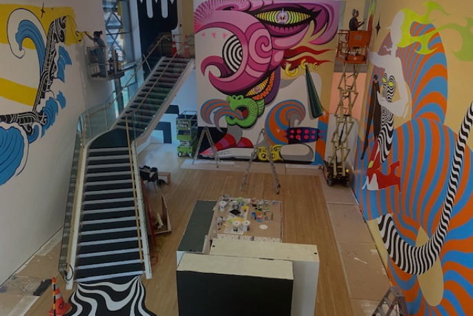 Tauranga Art Gallery's atrium has been transformed into a vibrant, psychedelic world dominated by an epic, fire-breathing taniwha by Te Whanganui-a-Tara-based Dream Girls Art Collective.