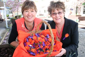 | Sharon Hitchcock and Vivianne Baldwin of Arthritis New Zealand will be selling orange gerberas, the symbol of hope, empowerment, support and happiness, during Arthritis Appeal Week, September 25 to October 2. |