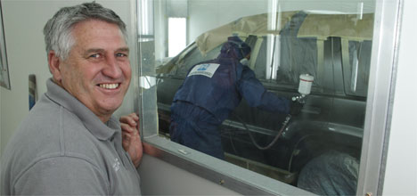 Colin Davis Panelbeaters owner Graham Logan watching automotive refinish technician Chris MacDonald spray a car with the water based paint.