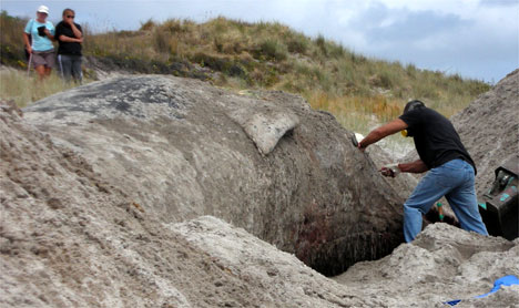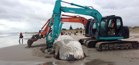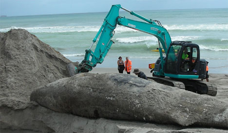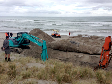 Diggers work to remove sand down to at least four metres to bury the whale.