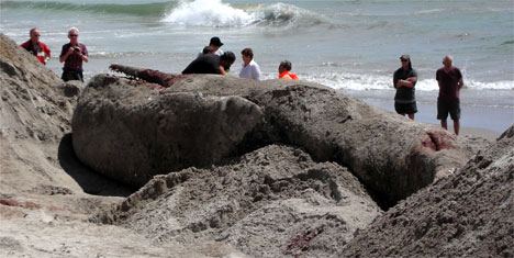Crowds of people gathered at the beach this morning to watch as the whale was transported to the high tide mark and buried.