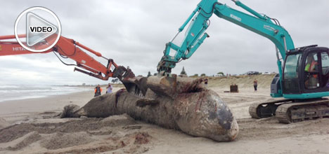 Department of Conservation officials and local iwi are using two diggers to bury the whale at the beach about 100 metres west of the Papamoa campground this morning.