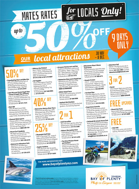 Tourism Bay of Plenty's ‘Mates Rates – for Locals Only' promotion offers discounts of up to 50 per cent to locals only, for some of the area's top tourism-related venues and activities.