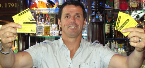 Hospitality New Zealand Bay of Plenty chairman Clayton Mitchell, with the drinking-related yellow cards he administers in both his Mount Mellick and Ivory bars.