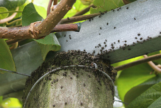 Early this week the aphids were found crawling on fruit, vines and support structures on Neil Brough's gold kiwifruit orchard and he is concerned they may trigger the fungus sooty mould to grow on his fruit, making it unsuitable for export.