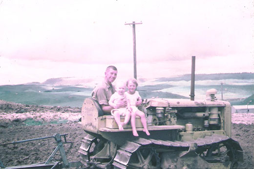 Robert Laidlaw, on his Caterpillar D2 5J 4500 with daughter Helen and son Andrew; photographed in 1970 at Western Bays, Lake Taupo.