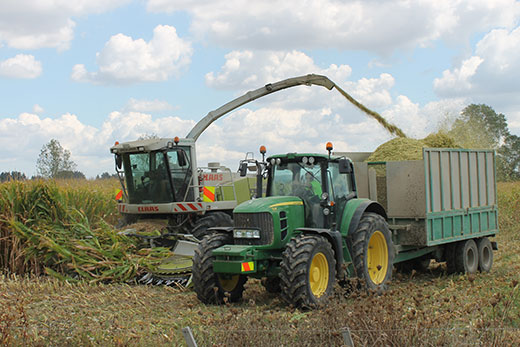Co-ordination is essential: harvester and tractor drivers work in unison to harvest a maize silage crop on a farm near Te Kauwhata.