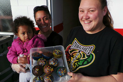Mariyah Koria, 2, Aroha Koria and Renae Mohi with cupcakes.