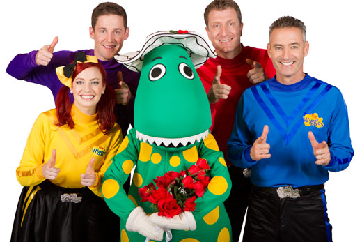 The Wiggles Emma Watkins, Lachy Gillespie, Simon Pryce and Anthony Field, with Dorothy the Dinosaur.