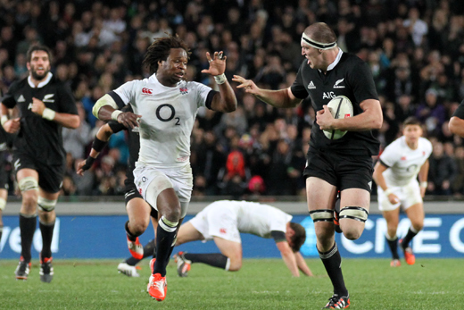 Chiefs and All Black lock Brodie Retallick fends off English wing Marland Yarde. Photo: Tracy Hardy.