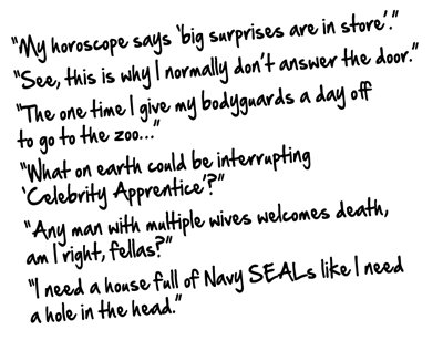 The notorious bin Laden also took an overseas trip apparently – taking a close-up view of some sea life. He'd already had a close encounter with a seal and was left with holes in his 'jamies.