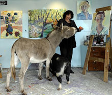 Among the many regular visitors to her exotically located studio is a kune kune pig named Hatty and a very stubborn donkey named Bella.