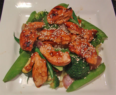 Place vegetables on a plate and add chicken and glaze juice over the top and sesame seeds, season with salt and pepper. Enjoy!