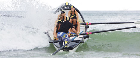 The Mount Maunganui women's boat crew head out through the Whangamata surf on Monday. Photo by Jamie Troughton/Dscribe Journalism.