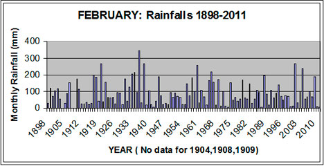 Since 1898 there have been 11 February months with rainfall of 200 mm or more, and 15 February months with a rainfall of more than double the average. In contrast, 10 February months have had rainfall of 10 mm or less, including both 2010 and 2011.
