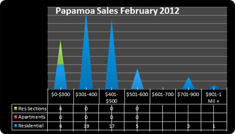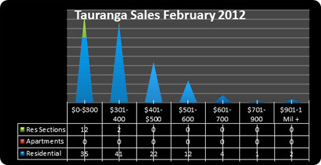 Tauranga had 131 sales in February - in the corresponding period in 2011 there were 92 sales, an increase of 42%. The bulk of the sales were between $70,000 to $400,000. Two sales achieved over $900,000, one of them at $1.5m. In the same period last year, there were no sales over $900,000.