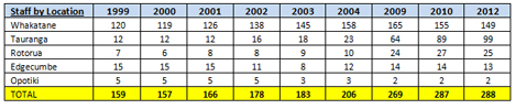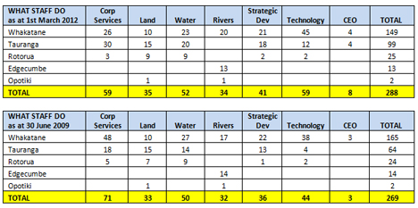 The purchase of a substantial office in Tauranga was supposed to see staff numbers increase in Tauranga to around 100 (in line with the increased workload in the sub-region), but it was also planned to reduce Whakatane staff to around 100. The table above shows that this just hasn't happened.