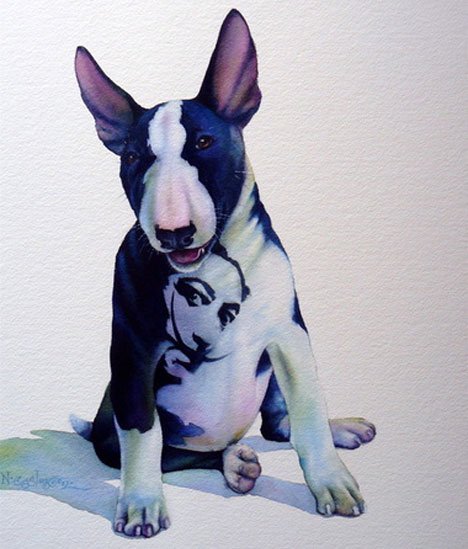 'Salvador Charlie' is a great example of Nick's humour where a stencil graffiti image of surrealist painter Salvador Dali has been worked into the markings of a English Bull Terrier pup's coat.