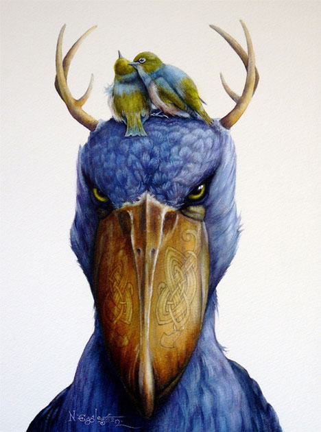 I just had to include this slightly distrubing 'Wild Things exhibition' offering by Nick Eggleston. It is definitely 'Sendak scary' and one has to wonder what the bird with antlers has in mind with regard to its small feathered passengers.