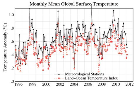 The graph shows the monthly mean global surface temperature anomaly from the base period 1951-1980. The black line shows meteorological stations only; the dotted line is the land-ocean temperature index obtained from satellite measurements.