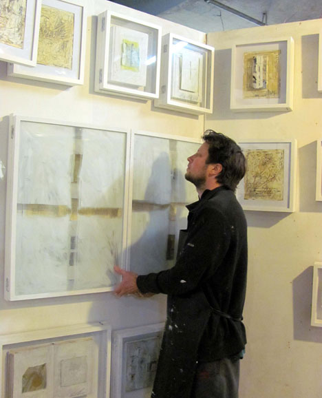 Kristian hanging his work at Rotorua's Art Expo Gallery.