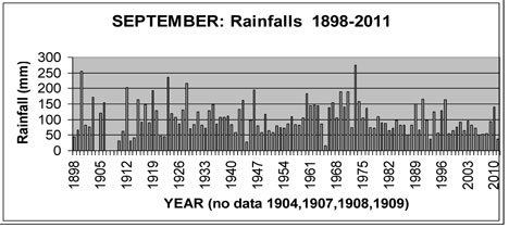 The graph of the September rainfall shows normal variations from year to year. There is a very small decrease in the average of the September rainfalls during the last 50 years (1961-2010) from an average of 103mm, compared with an average of 105mm during the 50 years from 1911-1960. This is similar to the months of January, February, April, May, June, July and August during the same periods, which also show small decreases in the overall rainfalls during the last 100 years, compared with a small increase in the March rainfalls. Since 1898, there have been five September months with a rainfall of 200mm or more (four of which occurred during the period 1900 to 1928, and only one September month since then), compared with six September months with a rainfalls of 40mm or less.