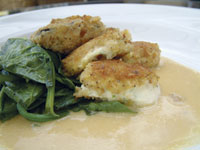 Once the mussels have set in the fridge about half an hour, dip in beaten eggs and milk then in the freshly made breadcrumbs. Allow to set again until required. To serve, pan fry mussels until golden brown in a little oil and butter for flavour. Drain and serve on a little of the strong favoured mussel saffron sauce and balance with some wilted spinach - absolutely delicious.