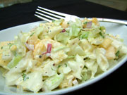 Toss the chopped cabbage in the spiced vinegar then drain, add the other ingredients then combine with the mayonnaise cover and chill for a few hours to let the flavours develop.