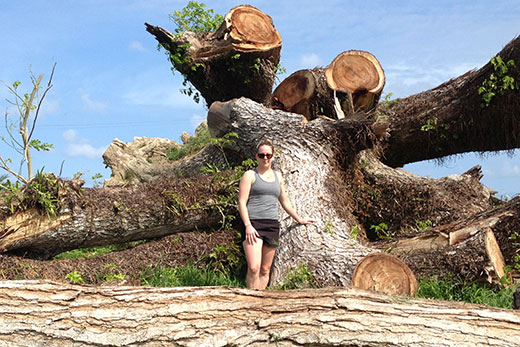 Leah Rogers with a huge tree brought down by Cyclone Pam, before it was milled by the portable mill from Turbo Sawmills of Tauranga.