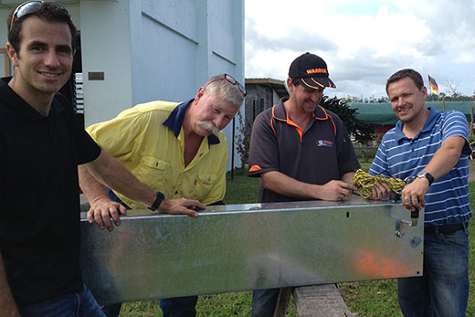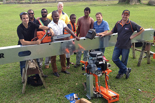 Checking out the Auto Warrior portable mill are from left Matt Meads of CSL, Peter Moran, Turbo Sawmill's owner Jake Peterson and Jeremy Pinero in Port Vila.